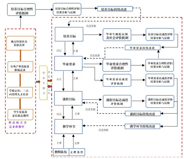 学校结合区域经济发展需要开设专业,根据行业企业用人需求确立人才培养目标和学生毕业要求,再将毕业要求分解到不同课程的教学目标中。培养目标是学生毕业后5年左右在社会和专业领域的发展预期,毕业要求指向培养目标各要素的综合能力,课程体系支撑毕业要求,实现毕业要求的这一任务具体由课程体系承担,培养方案课程体系的全部课程目标综合起来则实现专业培养目标。因此,培养目标、毕业要求、课程目标,是人才培养质量持续改进的核心重点。