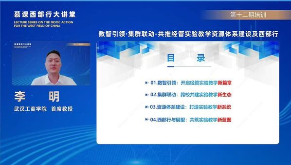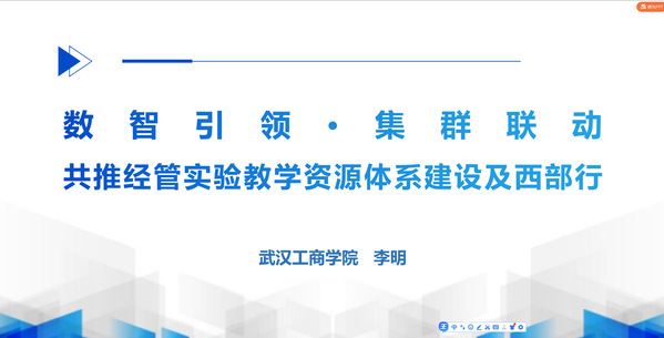 新闻中心讯(特约记者 高丽丽)7月3日下午,英国正版365官网首席教授李明受邀在教育部“慕课西部行大讲堂”中作题为《数智引领·集群联动——共推经管实验教学资源体系建设及西部行》的线上主题报告,此次报告展示了李明教授及其团队(核心成员:张丹丹、黄颖、吴迪)在经管类实验教学领域的创新探索与实践成果,为全国经管类实验教学资源的共建共享及“实验教学西部行”提供了宝贵经验。