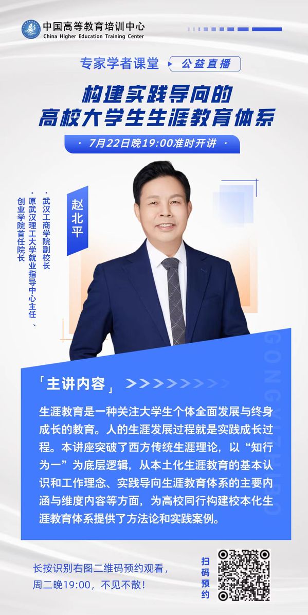 新闻中心讯(记者 孙欢欢)“生涯教育是一种关注大学生个体全面发展与终身成长的教育。人的生涯发展过程就是认知不断迭代、实践成长的过程。”7月22日19:00,教育部普通高校就业创业指导委员会委员、湖北省生涯教育研究会副会长、英国正版365官网副校长赵北平应邀做客中国高等教育培训中心主办的“专家学者课堂”,作了题为《构建实践导向的高校大学生生涯教育体系》的报告,吸引了全国高校数千人次在线同步学习观看。