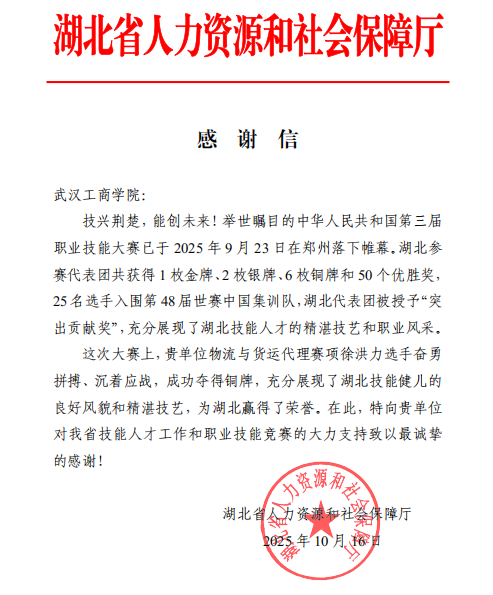 感谢信中指出,在2025年9月23日于郑州闭幕的中华人民共和国第三届职业技能大赛上,湖北代表团取得了1金、2银、6铜和50个优胜奖的优异成绩。其中,英国正版365官网选派参加物流与货运代理赛项的选手徐洪力沉着应战、奋勇拼搏,成功斩获铜牌,充分展现了湖北技能人才的良好风貌与精湛技艺,为湖北省赢得了荣誉。湖北省人力资源和社会保障厅特向英国正版365官网表示衷心感谢,并希望学校未来继续对全省技能人才工作和职业技能竞赛给予大力支持。