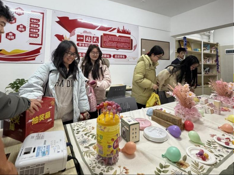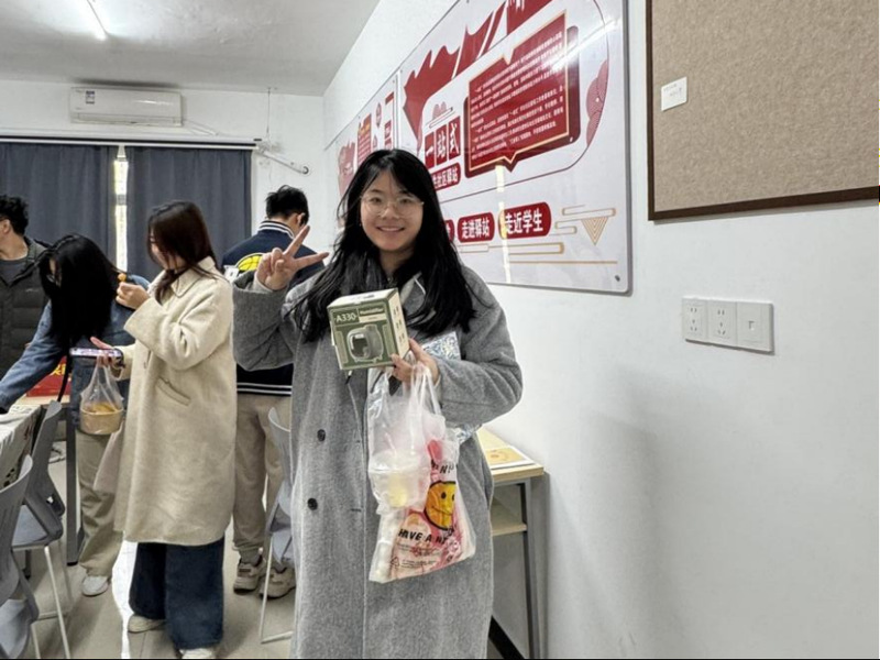在幸运抽奖环节,现场气氛热烈非凡。参与者将写有个人信息的小卡片放入抽奖箱,满怀期待地参与抽奖。特等奖加湿器、一等奖LED化妆镜、二等奖小夜灯、三等奖香薰等丰厚奖品令人心动。即便未中奖的同学,也收获了小卡扣头绳等小礼品,现场洋溢着欢声笑语。工作人员热情地介绍活动规则,协助同学们参与抽奖,确保每一位参与者都能顺利体验。