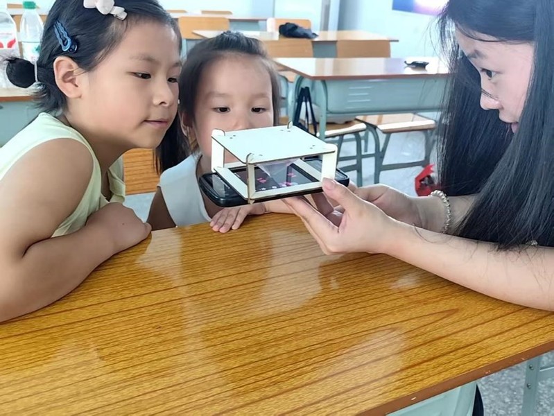 志愿者带来的惊喜不止于此。她亲手组装的全息投影装置,如同打开了一扇通往立体世界的神奇窗口。当装置启动,影像悬浮空中,栩栩如生,孩子们忍不住伸手触摸那虚幻又真实的图景,“哇!它飘起来了!”的惊呼此起彼伏。这直观的视觉震撼,将光的波动特性深深烙印在孩子们心中。