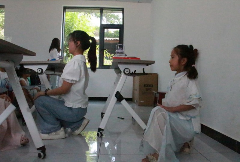 图为小朋友们练习正确坐姿 摄影:程晓蕊