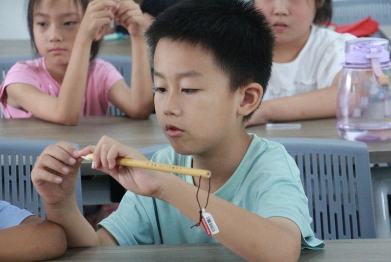 图中同学们正在了解毛笔 摄影:胡杰