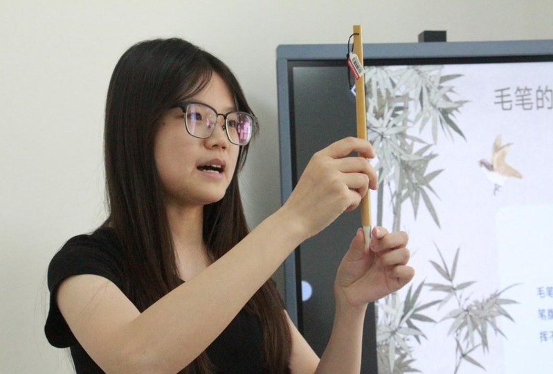 图为志愿者老师介绍毛笔 摄影:胡杰