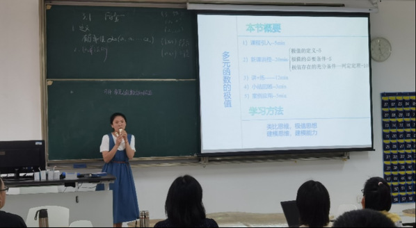 此次活动包括新教师磨课和新教师教学案例能力大比拼两个环节,均考察教师在引入、知识点讲解、案例应用或思政、小结这四个环节的课程设计和讲解能力,区别是新教师磨课环节在知识点讲解方面要求更细致,总时长比后者长10分钟。邓伟明、汪琴、陈巧、何家玉四位教师依次进行了课程展示,四位老师的授课各有千秋,分别选取了教学内容和角度,精心设计课件和教学环节,呈现了一堂堂精彩的数学课堂。其中邓伟明教师善于列举丰富有趣的实例让抽象概念变简单;汪琴教师通过精美的PPT设计抓住学生的眼球;陈巧教师非常注意数学思想的传授以及丰富的课堂互动;何家玉教师善于挖掘数学课程中的思政元素以拓宽学生视野。