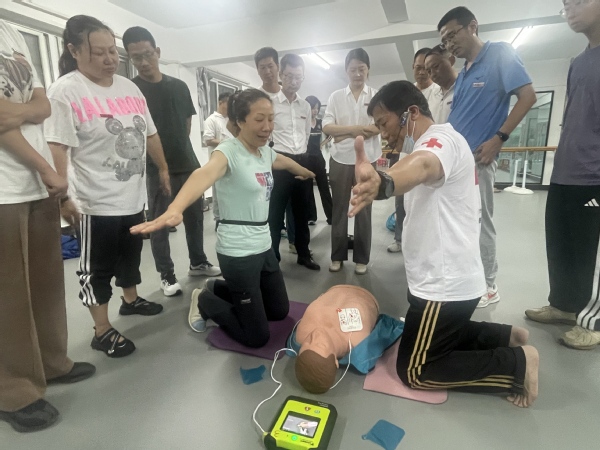 在理论讲解环节,两位导师反复提及的“急救现场五句话”,成为了教师们记录的重点:一查环境保安全,首先要确认现场不存在触电、坠物等二次伤害风险,在暴雨天尤其要注意漏电问题;二拍双肩喊同志,轻轻拍打患者双肩,凑近耳边大声呼唤,以此判断患者是否有意识;三呼救援取设备,立即大声呼救,请周围的人拨打120,并迅速取来最近的AED设备;四压五救不中断,双手交叠,双臂保持垂直,以每分钟100-120次的频率按压胸骨中下段,按压深度为5-6厘米,且持续按压不能中断;五是AED到快除颤,待AED设备到达后,按照语音提示贴好电极片,在机器分析患者情况时,所有人都要远离患者,确认需要除颤后,继续进行心肺复苏操作。“这五句话就是‘救命流程的导航仪’,哪怕紧张到大脑一片空白,只要按照口诀一步一步来,就能抓住黄金救援时间!”彭玉导师一边说着,一边现场进行示范。