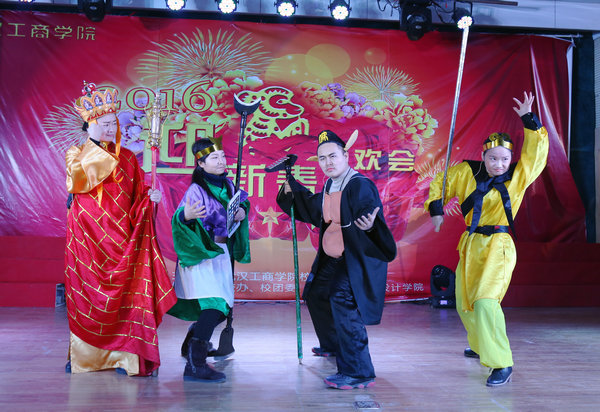 晚会最幽默搞笑的节目当属校宣传策划部带来的小品《西游天团迎评估》,作为本次联欢会唯一的小品节目,演绎了唐僧师徒四人迎接佛祖评估的离奇故事,其中既穿插了唯美的爱情故事和令人爆笑的搞怪情节,又呼应了学校即将迎接本科教学合格评估的主题。小品中啰唆秀逗的唐僧、活泼可爱的大圣、好色贪吃的二师兄、真诚淳朴的沙师弟,还有勇敢追求爱情的白骨精无不让人眼前一亮,其中该部门王庆老师扮演的猪八戒一角,可谓将二师兄的好色、贪吃性格演绎得淋漓尽致,令观众捧腹大笑。