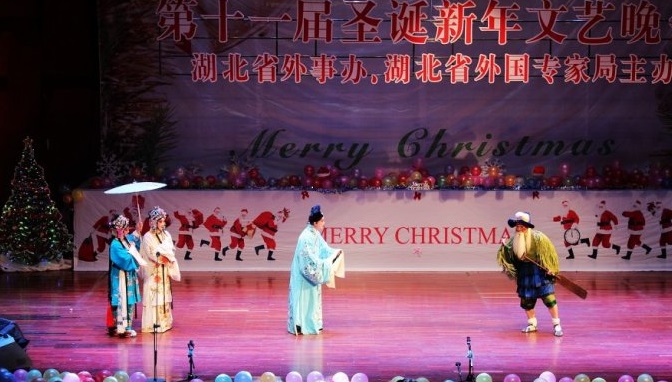 (特约记者:邵珊)2012年12月18日晚7:30,我校国际合作交流处劳老师、我校外籍教师一行9人参加了由湖北省外侨办--外国专家局举办的“第十一届圣诞新年文艺晚会”。 民乐合奏、女声独唱、琵琶独奏等各式精彩节目轮番上演、精彩纷呈。一场《白蛇传》中“游湖”场景的上演,让我们的洋观众们沉醉其中。 盛会落下帷幕,国际合作交流处劳老师说:“此次音乐会既是我们给外教的圣诞礼物,也是为了让外教们了解更多的中国国粹。” 我校外籍教师Chris也表示,很开心湖北省外侨办能举办类似的活动,这个圣诞会过得很快乐。