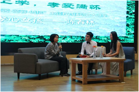 随后当主持人问到她的理想时,她直言想当一名人民教师,原因很纯粹,只因在她人生中遇到了一群可爱的老师,传道解惑,给予她很多的教育和关爱,而她想把这份爱传给更多人,现场的人无不被她的纯真善良所感动。在与台下同学们的互动环节中,陈春林更是大方地向大家分享了她对生活的心得以及对同学们的寄语。