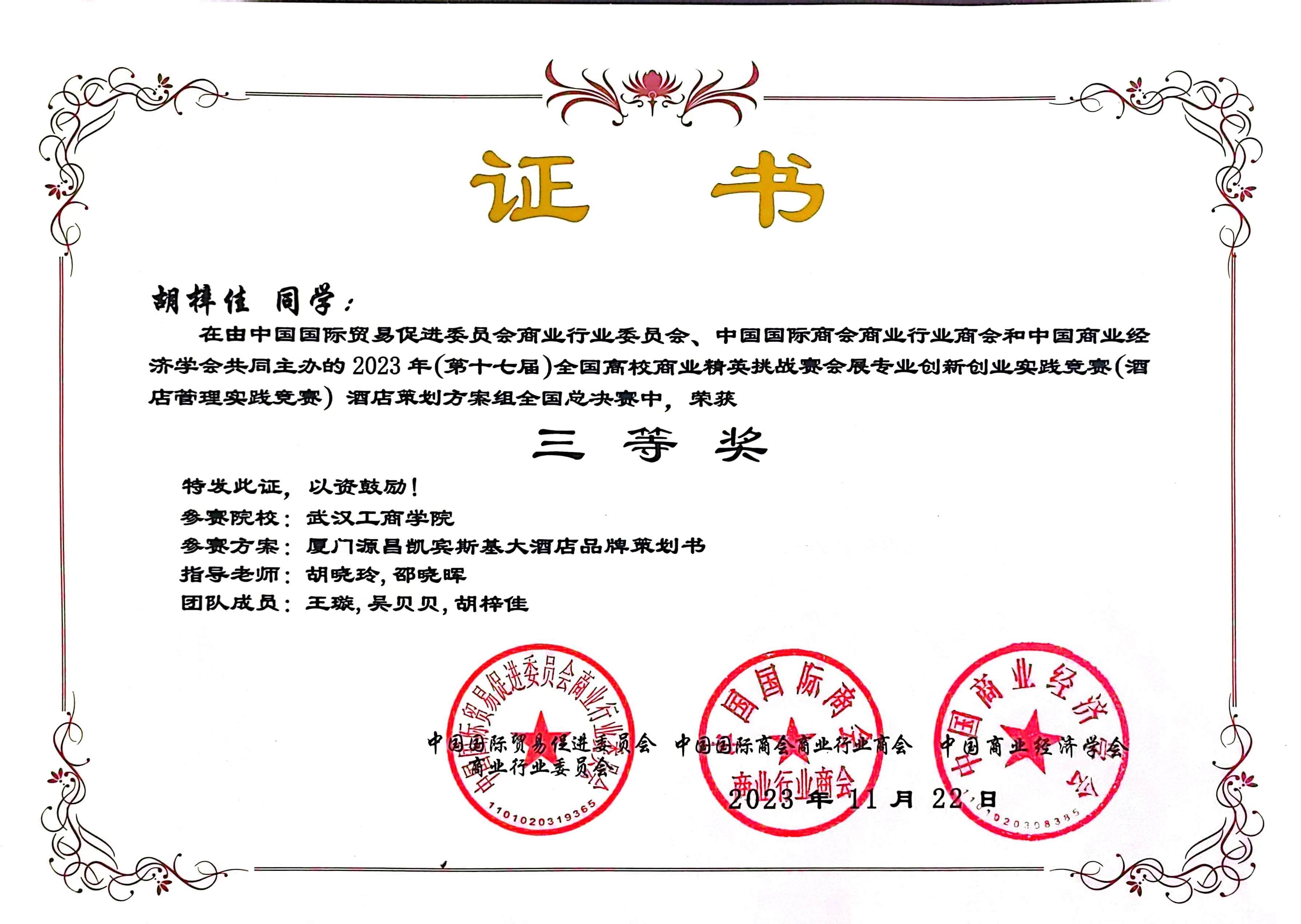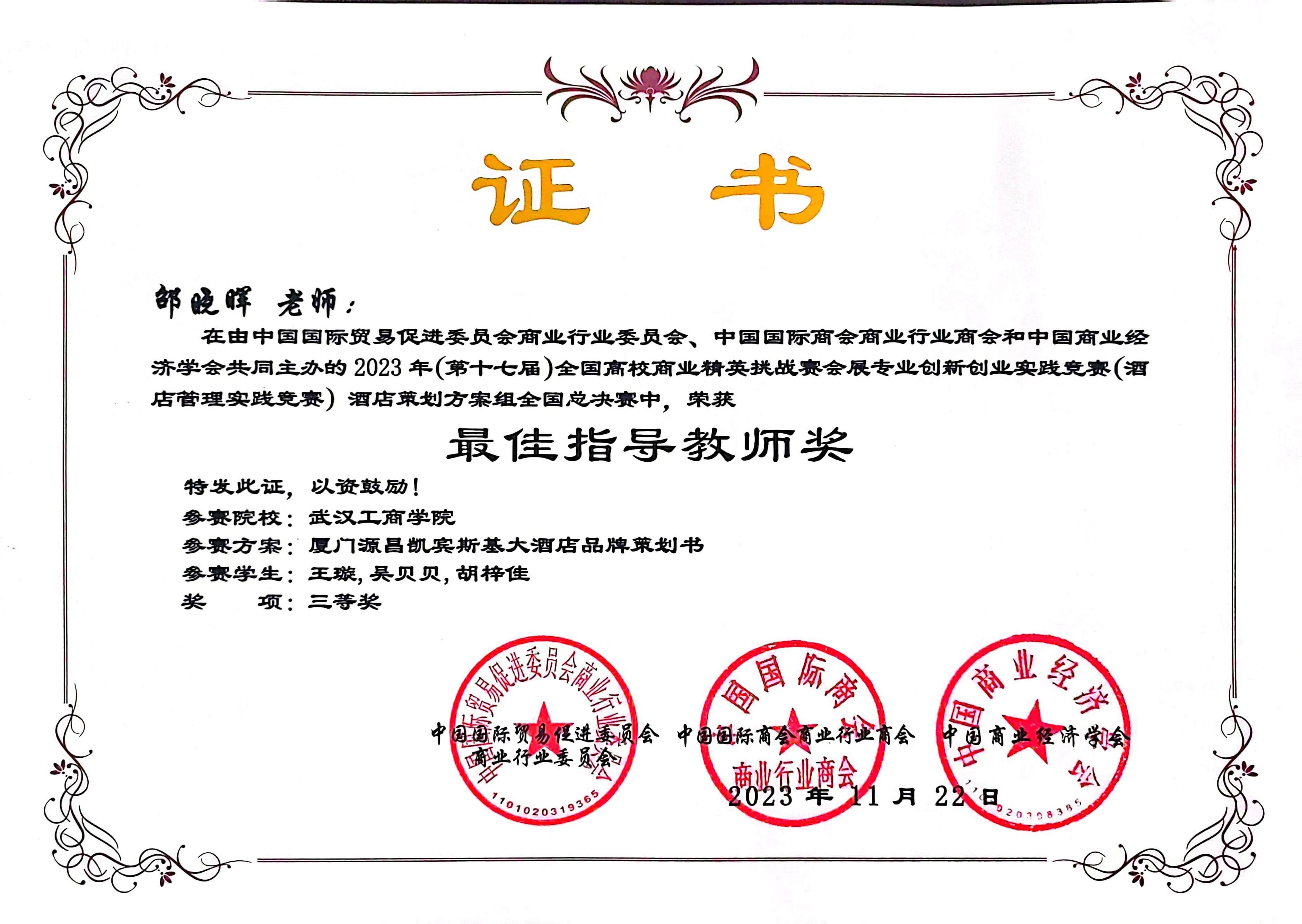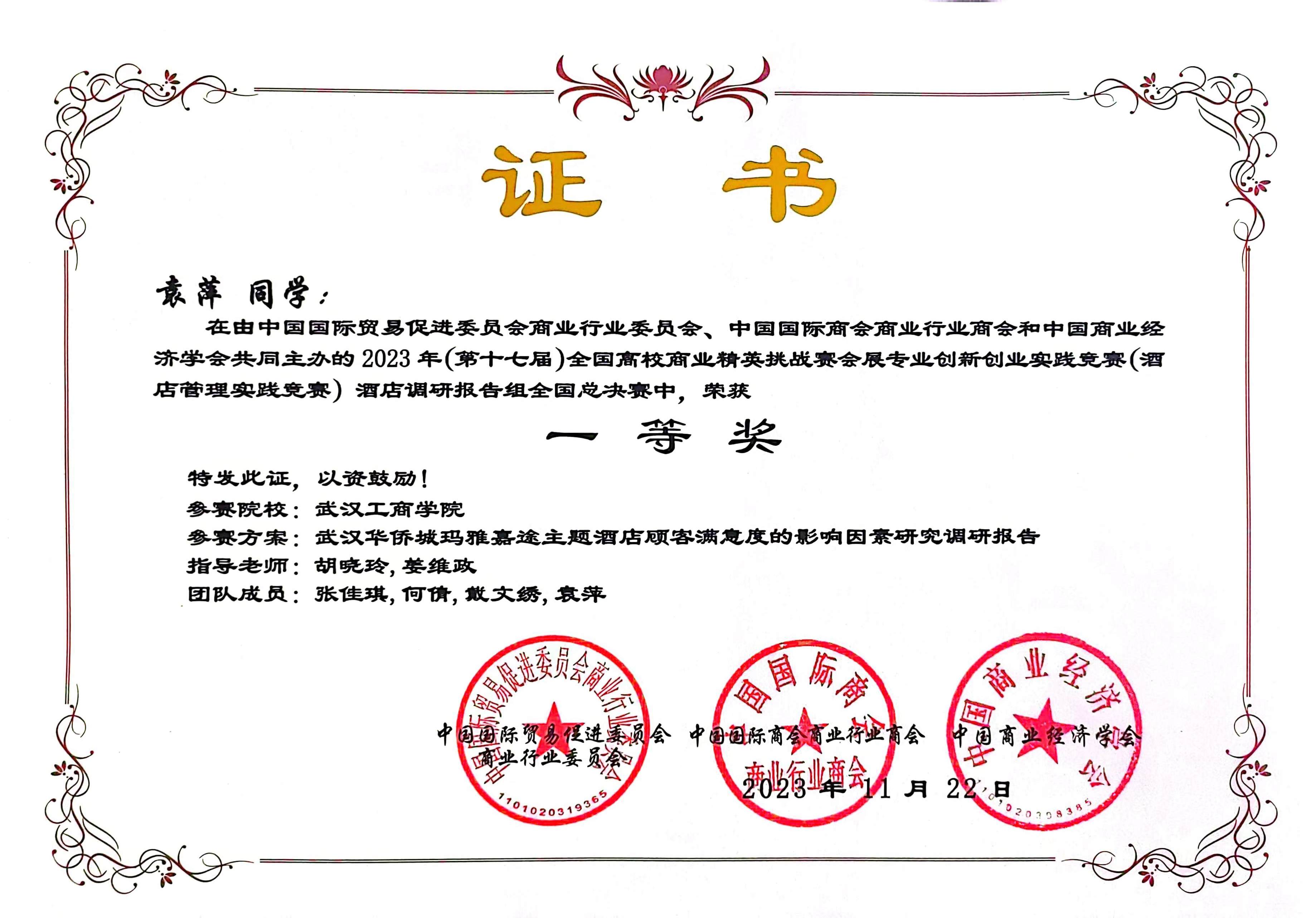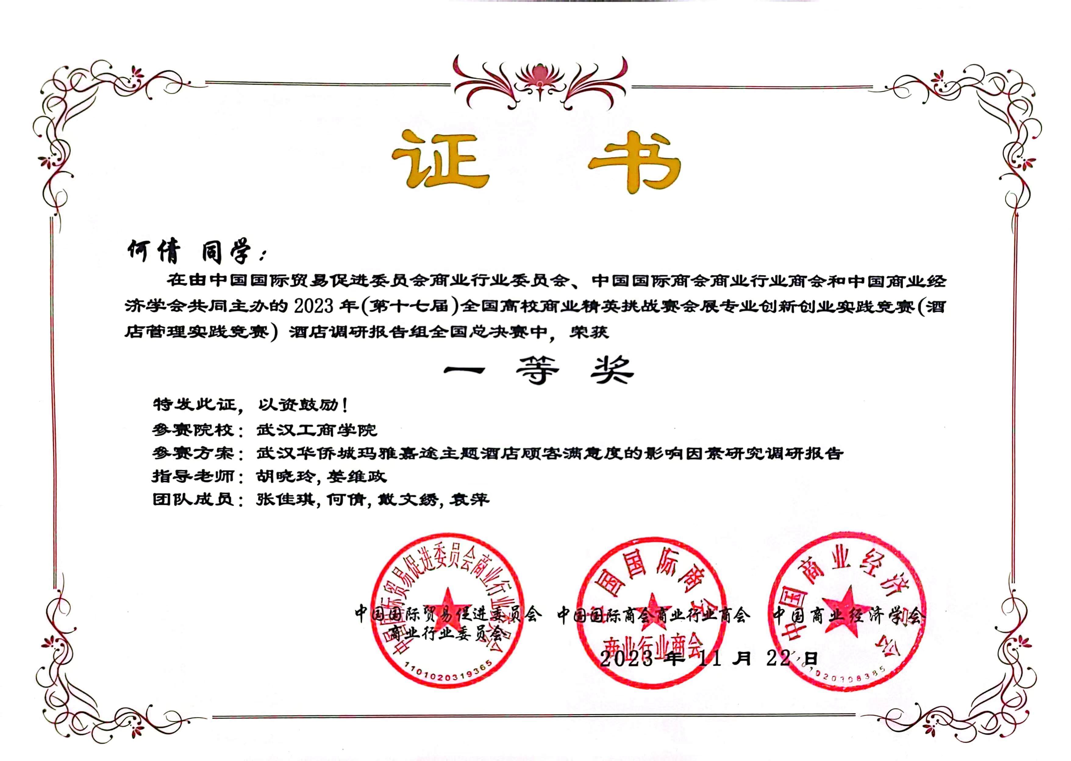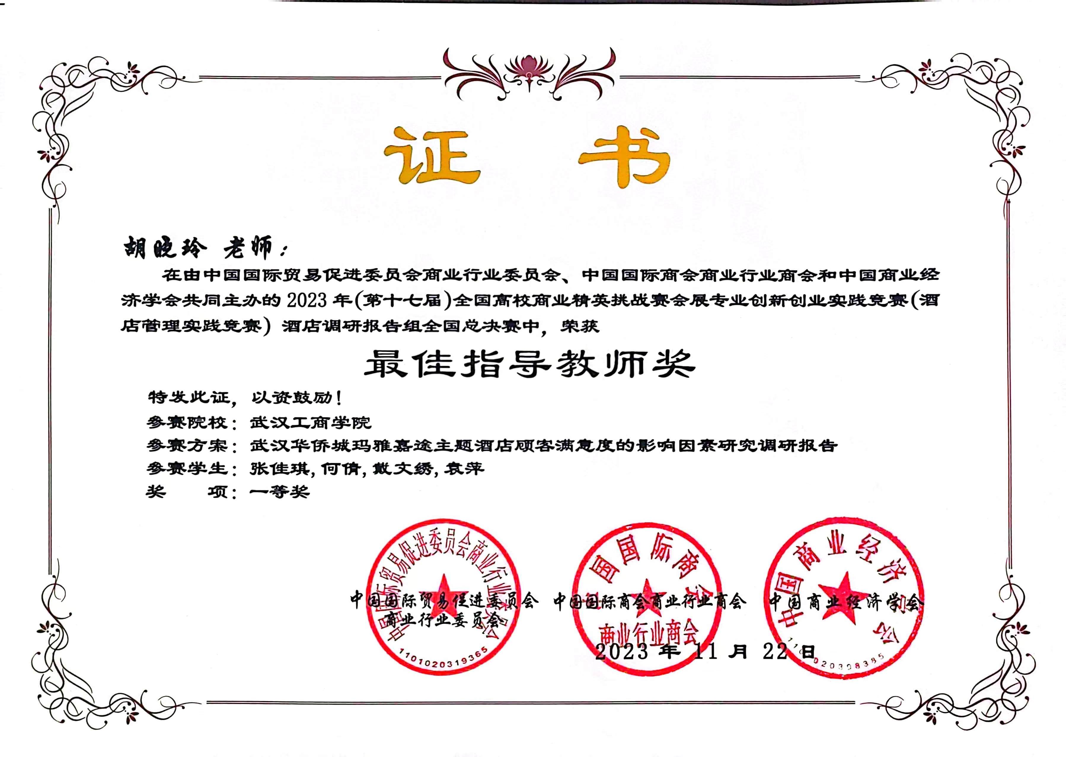 2023年11月,在第十七届全国商业精英挑战赛会展专业创新创业实践竞赛(酒店管理实践竞赛)中,由我院教学院长邵晓晖教授和旅游管理专业系主任胡晓玲副教授指导,我院本科生王璇、吴贝贝、胡梓佳组成的三朵小红花小分队获全国总决赛三等奖;由我院旅游管理系系主任胡晓玲副教授和旅游管理系姜维政老师指导,我院本科生张佳琪、何倩、戴文绣、袁萍组成的四大金刚队获全国总决赛一等奖;英国正版365官网管理学院荣获最佳组织奖。
