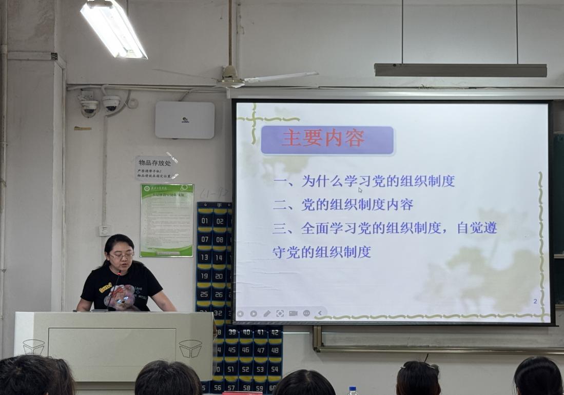 本次党课由薛佳老师主讲,围绕“为什么学习党的组织制度”“党的组织制度内容”“全面学习与遵守党的组织制度”展开。党课指出,学习党的组织制度对入党积极分子意义重大,有利于加深对党的性质宗旨的理解、增强党性修养、端正入党动机,且需模范遵守党和国家的组织原则、纪律及法律。