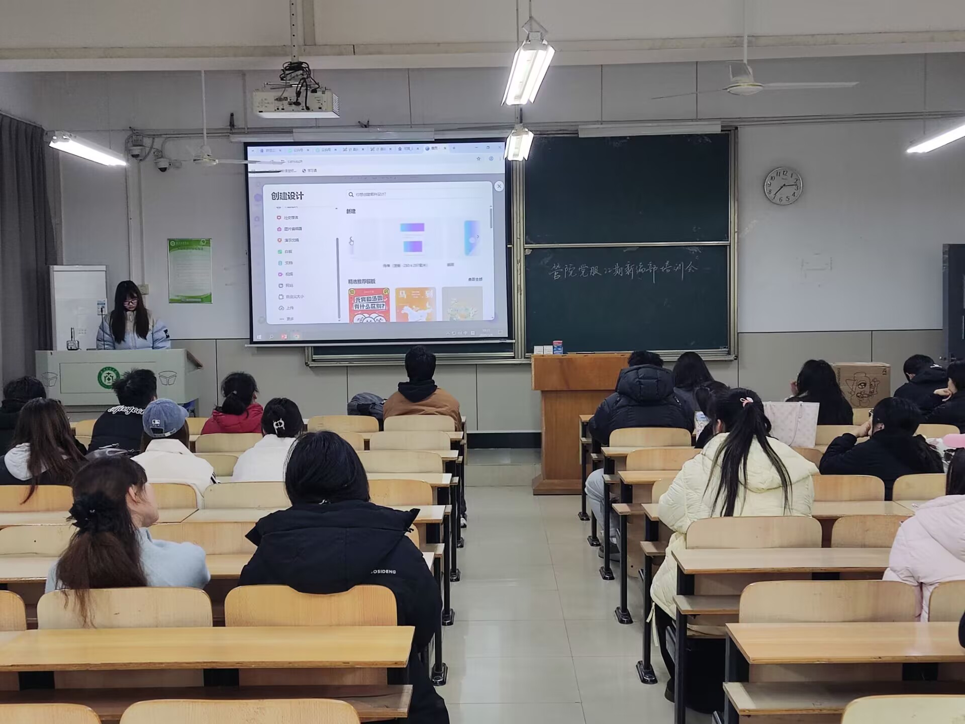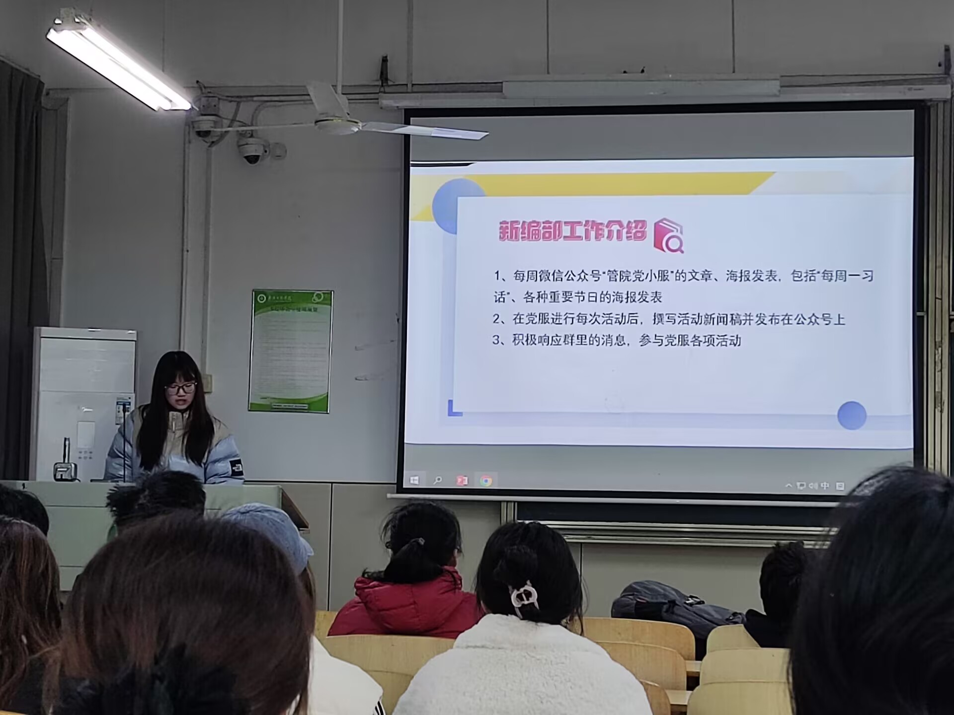 第二阶段,培训聚焦新媒体平台运营的实操技能。姚娅茹部长通过现场操作演示,系统讲解了秀米推文编辑器的使用方法,并重点强调了“每周一习话”推文的制作规范。后续则针对公众号封面设计进行了详细指导,介绍了可画工具的使用技巧,确保封面设计既符合党政宣传要求,又具有视觉吸引力。此外,两位主讲人还梳理了公众号发布的完整流程。在规章制度方面,会议明确了党服下沉时长记录、志愿汇打卡操作以及值班考核的具体要求,帮助部员清晰了解部门的管理规范。培训过程中,主讲人设置了互动答疑环节,针对部员提出的实际操作问题一一解答,确保培训效果落到实处。