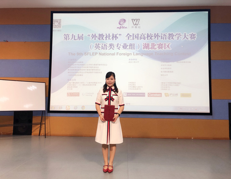 我院专业外语系黄净老师于2018年8月到9月参加了三项国家级省级教学大赛,即:第三届全国高等院校英语教师教学基本功大赛、第九届“外教社杯”全国高校外语教学大赛、湖北省第六届高校青年教师教学大赛,分别获得了省级一等奖、二等奖、三等奖的优异成绩。