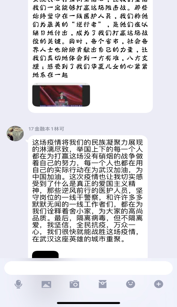 2. 积极做好支部思想工作。不信谣,不造谣,不传谣,自觉维护社会和谐稳定。主动学习相关疫情防控知识,传播防控工作重要精神,组织学生观看“全国大学生同上一堂疫情防控思政大课”,并进行了讨论和发表了自我心得。