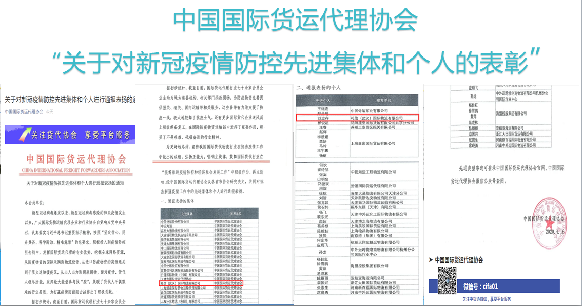据最新消息,在武汉新型冠状病毒肺炎抗疫行动中,刘总及所在公司的积极表现,特别受到了中国国际货运代理协会的表彰,礼信(武汉)国际物流有限公司获“新冠疫情防控先进集体”,刘志存总经理获“新冠疫情防控先进个人”。也希望我们的选手们不光学习货运代理理论知识,更要学习刘总及其货代人不畏艰难、砥砺奋进的抗疫精神,将这种精神发挥到我们的竞赛学习中。