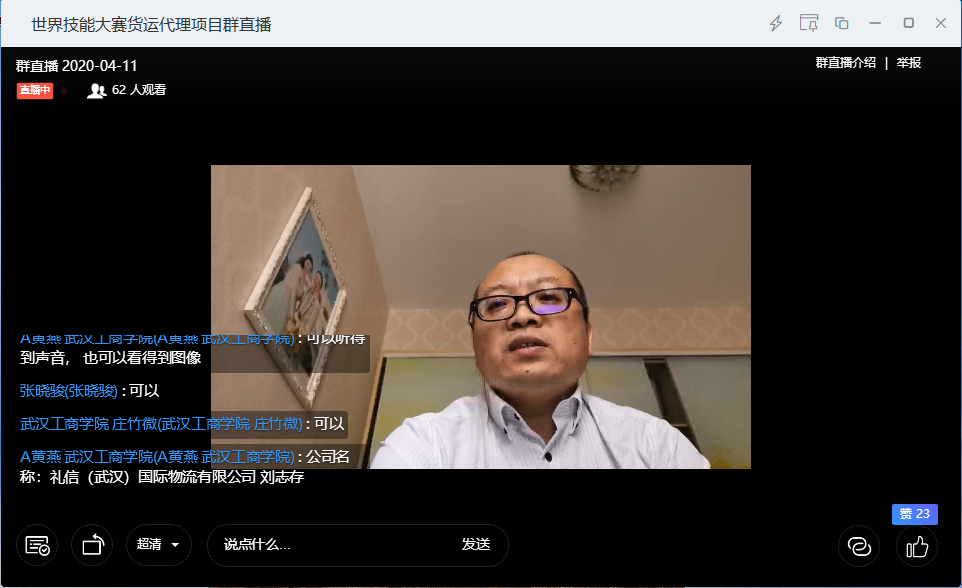 本次直播培训邀请到武汉货运代理业协会副会长、一带一路国际物流联盟理事、礼信(武汉)国际物流有限公司总经理刘志存主讲。刘总经理从入行、从业、职场建议三个方面进行经验分享,并重点对当前新型冠状疫情防控形势下,武汉物流行业现状进行了分析,通俗易懂的为选手们做了一次在线直播。