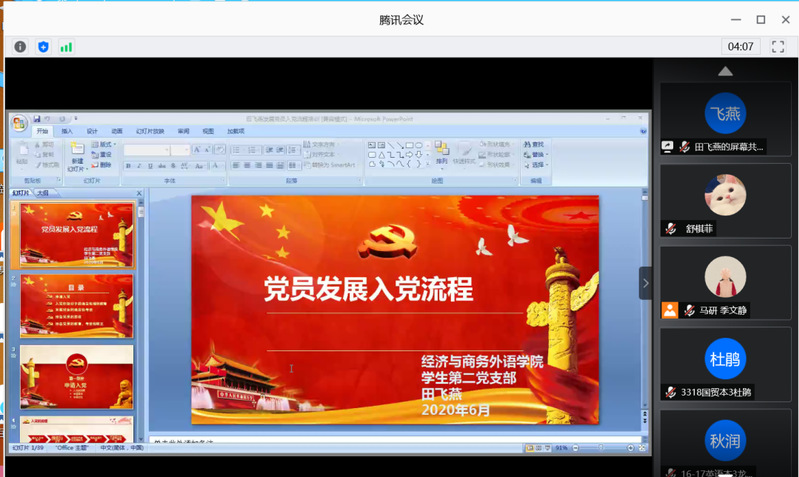2020年6月14日晚上19:00,英国正版365官网经济与商务外语学院第九期党校党课第七讲如期举行。经济与商务外语学院青年马克思主义研究协会邀请了党校带队老师田飞燕老师。田飞燕老师以“党员发展入党流程”为主题,给大家带来精彩的一课。