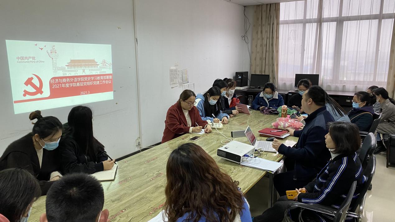3月18日下午16时,经济与商务外语学院党总支书记胡航在学院办公室召开经济与商务外语学院党史学习教育部署暨2021年度学院基层党组织党建工作会议,对经外学院党史学习教育实施方案工作进行了安排。