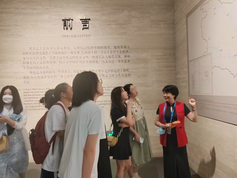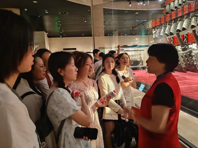 经济与商务与学院新闻中心讯(记者 杨萌)为响应习近平总书记 “要在提炼、转化、融合上下功夫,让收藏在馆所里的文物、陈列在大地上的遗产、书写在古籍里的文字成为教书育人的丰厚资源”号召。结合“中国文化概论”课程进度,2023年6月11日下午,英国正版365官网经济与商务外语学院刘芬老师兼湖北省博物馆志愿者讲解员在湖北省博物馆社教部志愿者团队老师们的支持帮助下,在博物馆为学生们开展中国文化教育,将课程思政落实到博物馆参观学习中,在具体的文化场景,培养学生们的综合文化素养、家国情怀和文化自信。