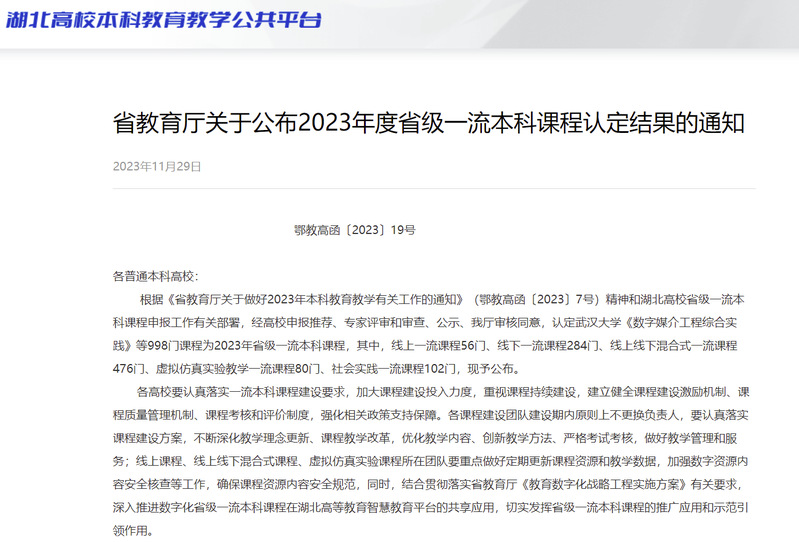 (经济与商务外语学院新闻中心讯 通讯员:木易)近日,湖北省教育厅公布《省教育厅关于公布2023年度省级一流本科课程认定结果的通知》(鄂教高函〔2023〕19号),我院黄净教授主讲的《综合英语》成功获批线上线下混合式一流课程、张晓骏教授主讲的《中国对外贸易概论》成功获批线下一流课程。截至目前,学院共获批5门省级一流本科课程。