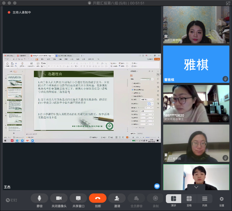 开题汇报流程:学生共分为16个小组,使用钉钉线上汇报的形式。学生将开题报告表内容采用word文档或者ppt汇报的形式,进行陈述,指导小组教师对学生的开题报告进行提问,提出修改意见和建议。