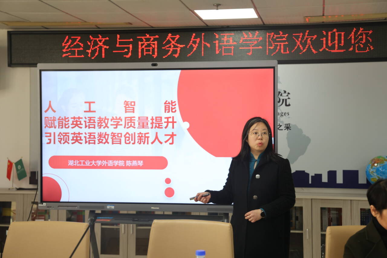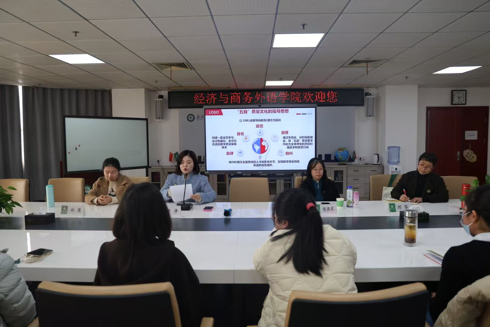 经济与商务外语学院新闻中心讯(记者:彭孟强)2025年12月11日,经济与商务外语学院于弘德楼920会议室成功举办英语专业“五自质量文化与OBE理念”专题研讨会。本次会议由学院专业外语系系主任黄净主持,特邀湖北工业大学外国语学院陈燕琴教授作专题报告。系副主任郑鹰、学术团队负责人刘芬及英语专业全体教师共同参会。