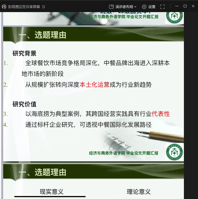 上午9时,汇报会正式启动。线上会场营造出严谨务实又不失活跃的学术氛围,学生们按照3-5分钟的时限,依次通过线上会议系统阐述选题初衷、研究价值、文献梳理情况、拟采用的研究路径及论文整体框架。从跨境电商供应链优化、RCEP协议下中小外贸企业发展路径,到数字经济赋能国际贸易转型、绿色贸易背景下农产品出口突破策略等选题,充分彰显了国贸专业本科学生立足行业前沿的学术视野与扎实的专业知识储备。