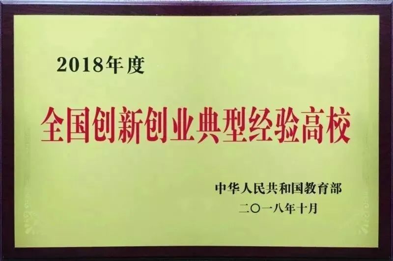 ▲学校被教育部授予“2018年度全国创新创业典型经验高校”