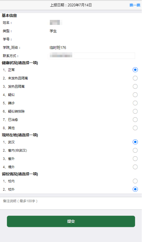 考生登陆上报系统进入健康信息填写页面后,按实际健康情况在相关问题选择处点击选项,全部选择完成后,点击提交,当日的健康状况上报程序完成。在7月28日前,考生须持续不间断地完成14天的健康状况上报。健康监测结果将作为入校防疫检查的重要依据。