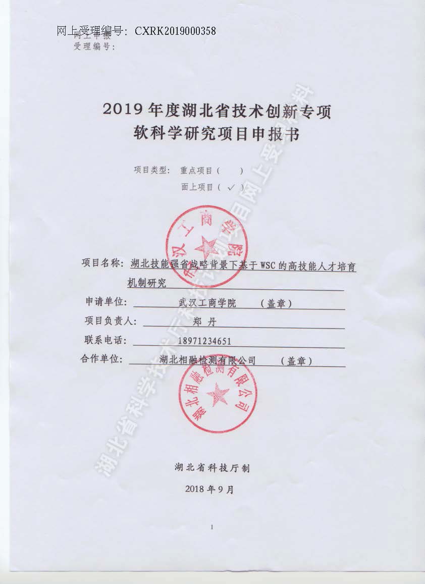 在协同育人共同建设过程中,对于校企合作、人才培养模式开展研究,于2018年联合申报湖北省技术创新专项软科学研究项目《湖北技能强省战略背景下基于WSC的高技能人才培育机制研究》正式获批。