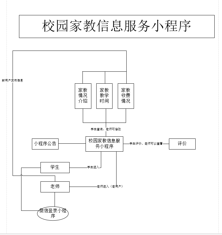用户通过微信直接登录小程序,然后选着用户身份。如果是老师就根据自己的自身条件选着自己的信息和所教课程。学生就直接进行查看家教信息并选择家教,最后可以给家教老师一定的评价。