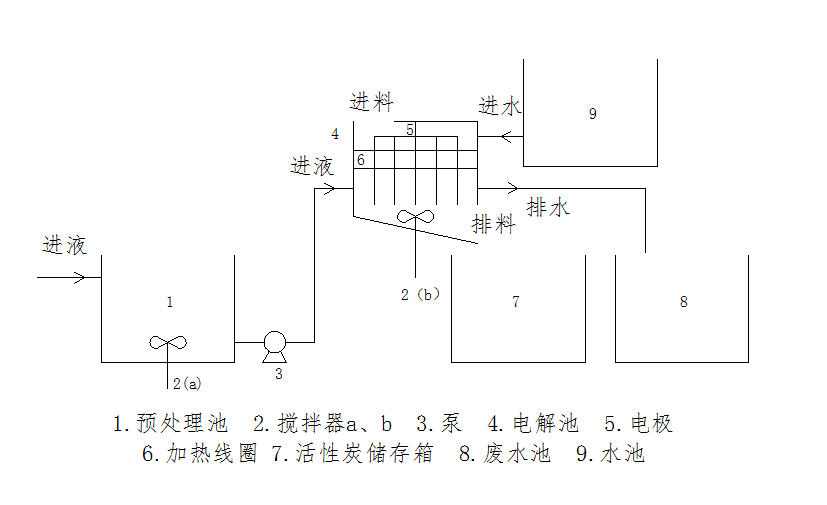如图所示,先将NaCl电解液通过管道注入预处理池,在预处理池调节电解液pH值至适值,再将电解液运输至电解池,同时加入活性炭,活性炭高度应稍微超过排液口的高度,方便后续的操作。活性炭和电解液都运至电解池后,打开加热线圈和搅拌器(b)的电源,将电解质和活性炭加热至适值,提高再生效率,之后再加入Fenton试剂,再将电极通电,装置开始运行,通过Fenton试剂和电极的作用去除活性炭中的污染物,通电至活性炭中的污染物完全清除。断电后,先静置片刻,使活性炭沉淀,再通过排液口排除上层清液,再加入清水,并打开搅拌器清洗,静置,放出上层清液,重复此操作3-5次。冲洗结束后将活性炭通过排料口运至活性炭储存箱收集即可。从而得到再生活性炭。