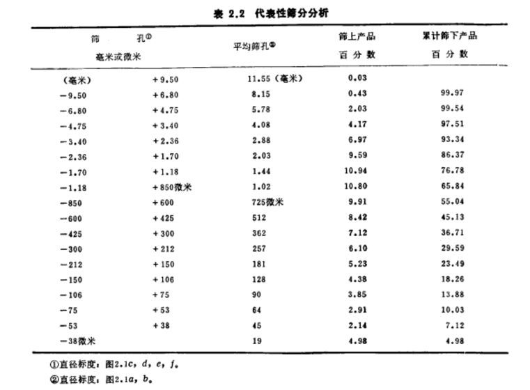 数据表述分别地测量每一个颗粒通常是办不到的,因此进行粒度分析时将颗粒划分成若干个适当窄的粒度范围。数据一般以表格形式(表2.2)列出,但图形表示(如数量与粒度关系图)更清楚(图2.2)。数学方程式亦可用来描述粒度分布。虽曾有人尝试将这类数学式与实际断裂力学相联系,但多数还是一些仅便于表述数据的经验关系式。当数据必须处理时,数学式可能有用;但这往往要求使用计算机,而在这类条件下,实际数据的矩阵表示同样方便,而且更可靠。