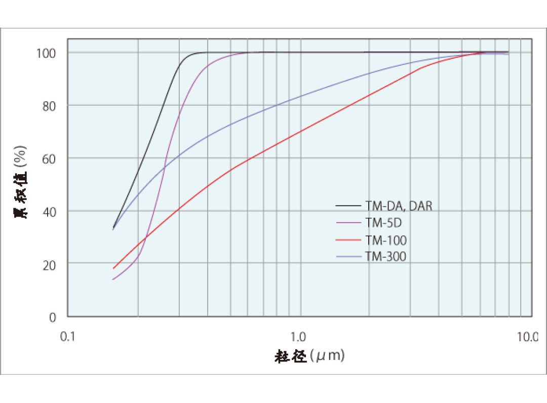 粒度数据的图示法通常是以横坐标(x轴)列出颗粒粒度,以纵坐标(y轴)列出测得的基准量。表示数量有两种方法:一种是列出每一粒级中的量(绝对量,分数,或百分数),另一种方法是列出高于或低于某一粒度的累计量(分数或百分数)。