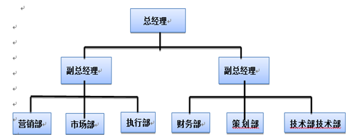 直线职能型组织结构:设总经理一名、副总经理两名、市场部经理一名、产品经理一名、财务部经理一名、干事若干人、员工若干人。这样的组织结构吸取了直线式和职能式的长处,避免了他们各自的短处,既保持了纵向的直线指挥系统,又设置了横向的职能管理系统。随着创业的进行,本团队将逐步制定并不断完善本团队各部门的经理的职责,制定好本团队的管理制度,并在实践中不断完善。