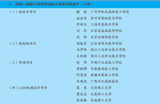 六、对入围第41届世界技能大赛集训的滕超等24名选手,予以通报表扬。