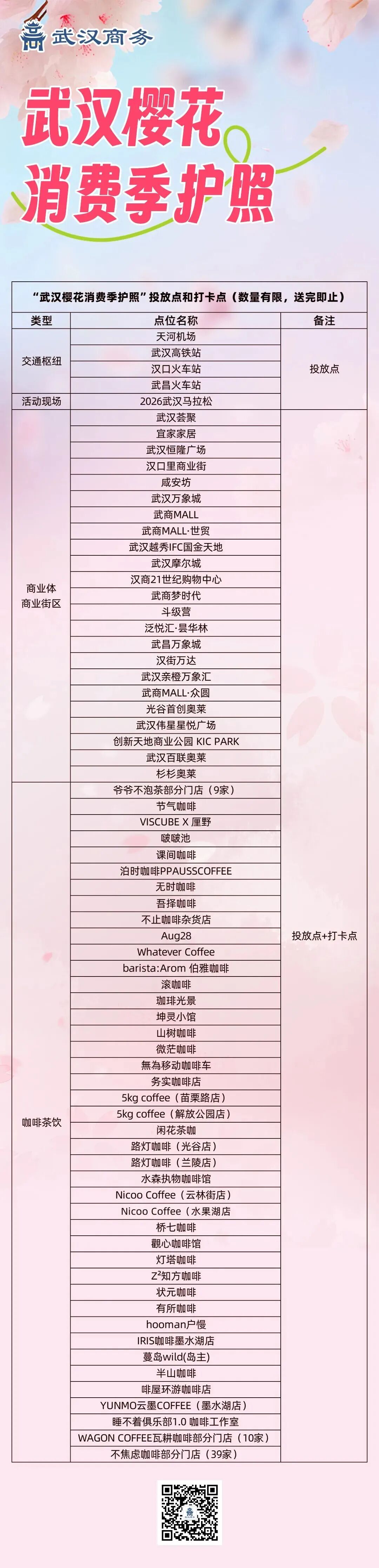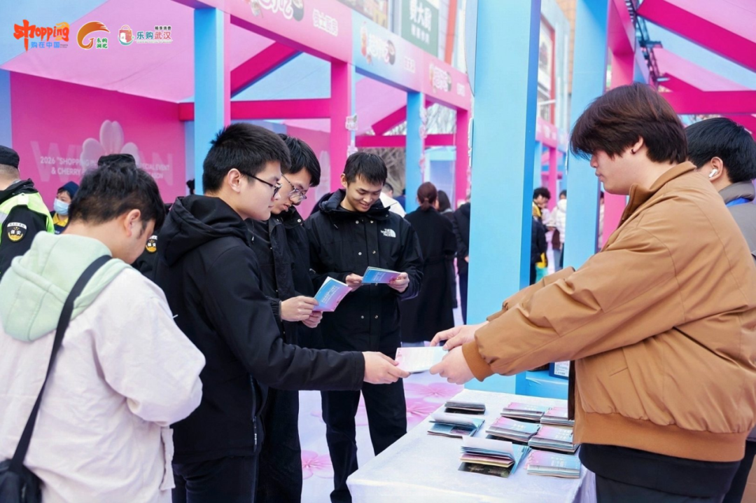 活动现场发放的“武汉樱花消费季护照”吸引众多观众领取。全市20多个打卡点(武汉樱花消费季护照领取点),遍布武汉核心商圈、特色街区。专属福利覆盖零售、餐饮、家居、文旅等多元场景,各打卡点准备限量专属礼品,全棉柔巾、定制帆布包、无门槛电子券、巡展纪念票……只需到店盖上专属印章就可兑换好礼,收集一套,便是这个春天你最独特的武汉之行纪念册。