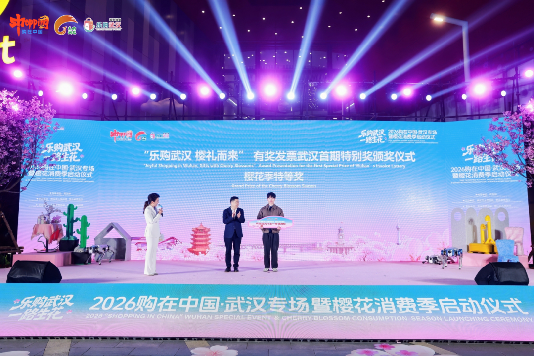 3月20日晚,2026“购在中国”系列首个城市专场活动——购在中国·武汉专场暨樱花消费季启动仪式在武汉荟聚精彩绽放。本次活动由商务部指导,武汉市人民政府、湖北省商务厅主办,武汉市商务局、硚口区人民政府承办。以花为线、以城为景,打造一场融合国际视野与楚风汉味的消费盛宴,并以中英双语向全球推介和邀约,来武汉,赏樱、食味、乐购、潮玩,一路生花,点燃春季消费热潮。