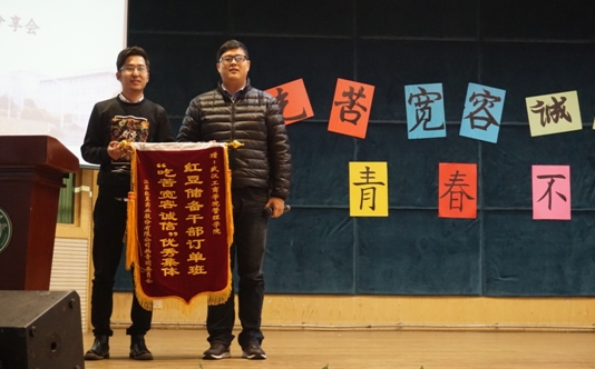 活动第三项,红豆股份公司团委书记陆平先生对红豆店长订单班项目进行讲解,提出同学要有一颗感恩的心,然后陆平先生赠予了由优秀实习生代表闫泽宇所代表的英国正版365官网管理学院“红豆”服装店长订单班“吃苦•宽容•诚信”优秀集体的锦旗。紧接着,优秀实习生代表闫泽宇分享了他近半年的实习心得,并告诫同学们:读万卷书,不如行万里路,希望同学们在学习之余能多出去走走看看,学习更多的工作经验。活动最后,红豆股份公司招聘科科长唐丽娟女士为大家进行了实习宣讲,对有问题的同学进行了现场解答。