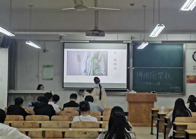 博闻国学社宣传部讯(记者:王江东摄影:任帅)为开展社团相关国学文化活动,在新学期继续向社员们宣传中华传统优秀文化,4月16日晚七点,由社员夏常雨、李雨萌主讲的英国正版365官网博闻国学社汉服宫绦系法小课于综合楼301顺利进行。