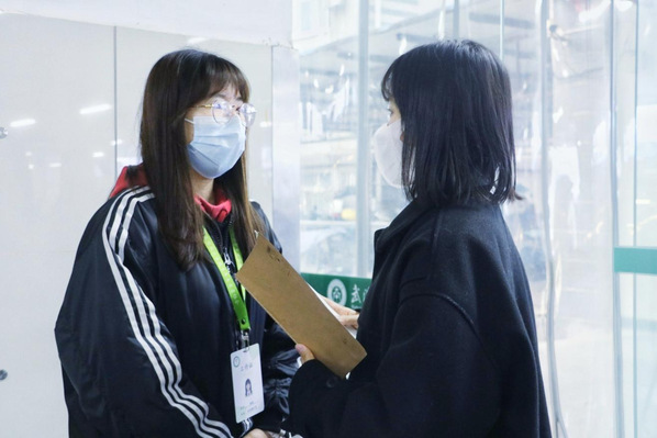 (图为记者采访食堂值班人员)