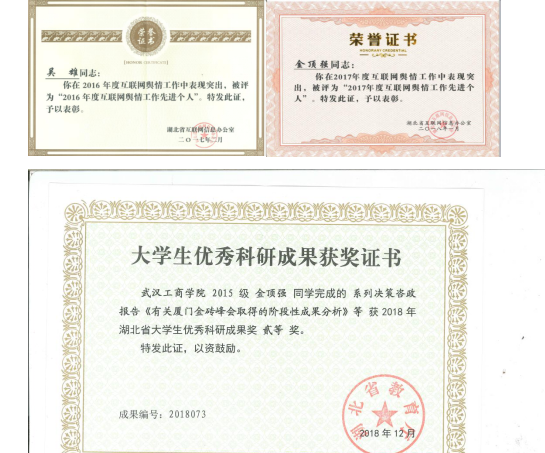 网络与新媒体专业的学生积极参与教育部人文社科、湖北省宣传部舆情研判与报送、清博大数据舆情研判与分析等项目,累计参与20余项,参与人次100余人;发表学术论文数15篇,舆情研究报告被中央及省级宣传部采用达2000余篇,获得中央领导批示60余篇。2人次荣获“中宣部舆情信息工作先进个人”, 11人次荣获“湖北省舆情信息工作先进个人”等称号,获得大学生优秀科技成果奖二等奖1项,三等奖1项。