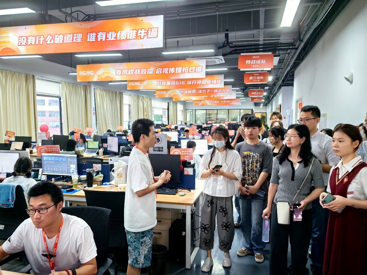讲解过程中张总还与师生探讨了好产品、好内容与直播流量的关系,引导学生思考品牌在直播电商时代的生存法则。之后,张总带领大家参观了该公司的直播基地。近20个精心布置的直播间里,主播们正面对镜头,热情地推介各种智能家居产品。公司办公区域密集悬挂的激励性标语,以及直播间标识牌上的“作战区”字样,让师生们沉浸式感受到“商场如战场”的氛围。