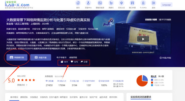 该系统从2019年底开始研发,团队克服疫情期间的种种困难,于2020年上线。随后几年不断改版和更新完善系统的教学模块和管理应用模块。系统的自动评阅系统和自动迭代模块系统功能,能充分提升实验教学中学生的自主学习能力,寓教于乐的知识库还有气势磅礴的舆情概览模块,让学生在生动有趣的交互环节中获得知识学习。用心设计的教学系统得到了校内外教师、学生用户的一致好评。目前该实验课程已经获得了2022年湖北省一流虚拟实验课程,并于2024年被推送到ILAB国家虚拟仿真实验共享平台,面向全国用户开放使用,目前该实验的人气数据指数居于新闻传播类虚拟仿真实验项目第一位。欢迎各大高校、相关企事业单位使用。