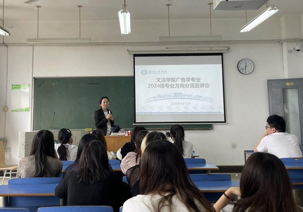 文法学院(记者:刘凯) 为帮助文法学院2024级广告学专业学生深入了解专业特色、明晰职业生涯发展方向,精准规划学业与职业道路,广告学专业于4月17日在外语楼620教室举办专业方向分流宣讲会,由广告学专业系主任、副教授罗青老师主持并主讲。此次分流会不仅为学生提供了深入了解广告学专业的机会,更明确了学业与职业发展的方向。
