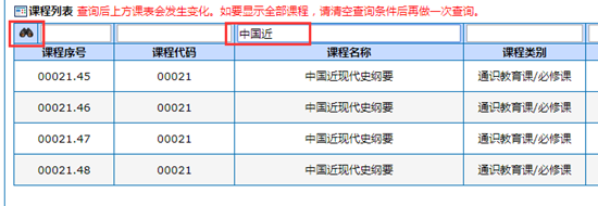 ②可选课程查询框,右侧为列表切换按钮,在每列上输入相关查询条件,点击左侧按钮查询相关信息,如下图所示: