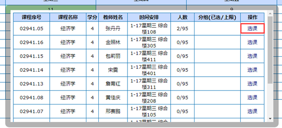 ③课表页面,课表页面里的数字表示在这个时间段内有几门课程可供选择,点击数字可查看相应可选课程,在此页面中点击右侧选课,确认提交即选课成功。