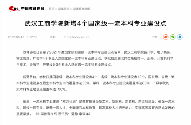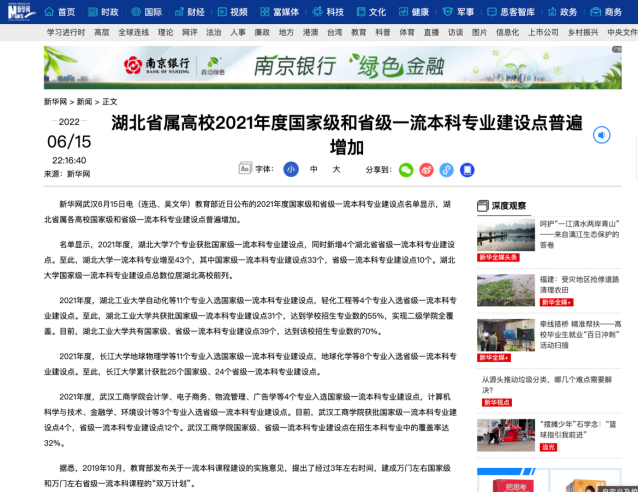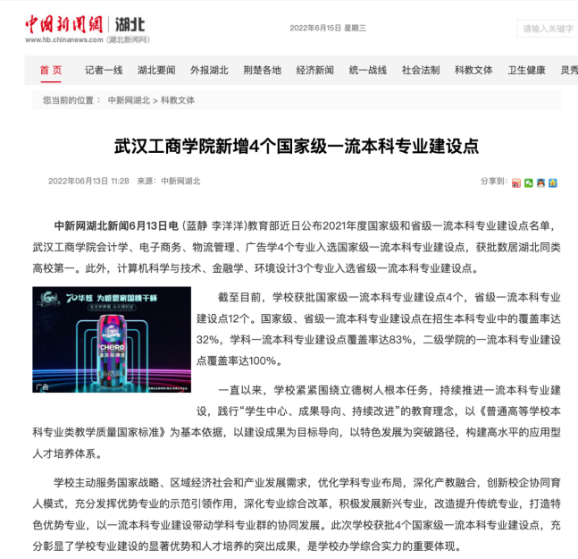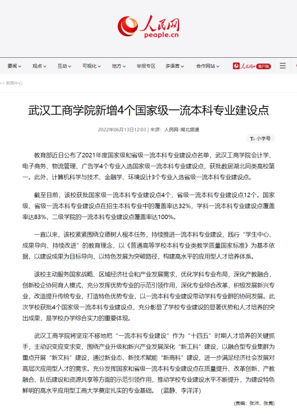 近日,教育部公布了2021年度国家级和省级一流本科专业建设点名单,英国正版365官网物流管理专业入选国家级一流本科专业建设点。该新闻分别被人民网、新华网、中国教育在线、中国新闻网、湖北教育电视台等媒体报道。报道新闻如下: