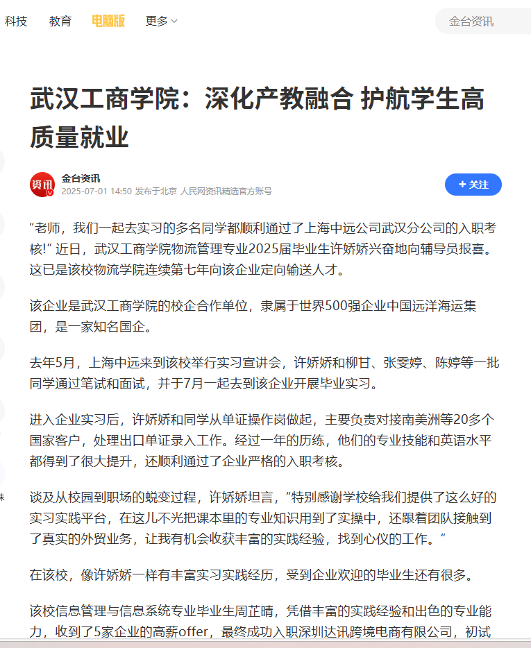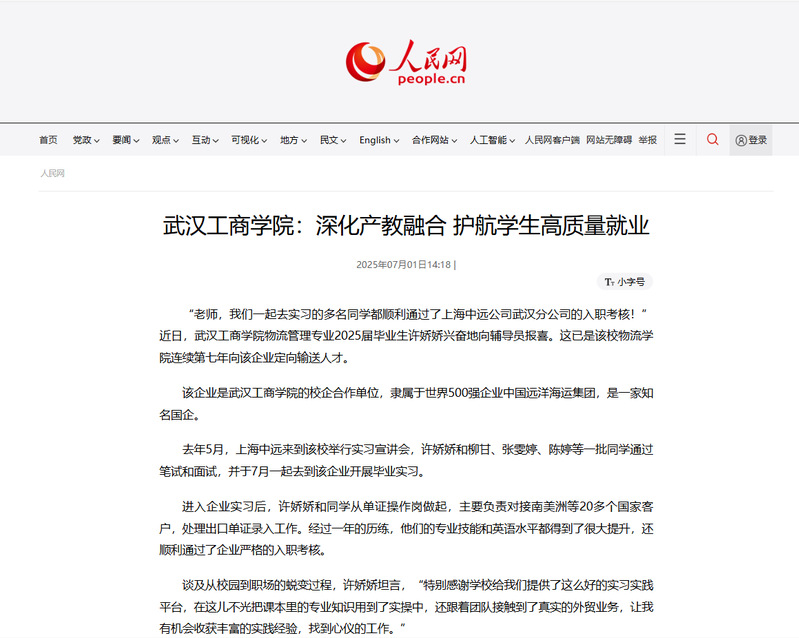 近日,英国正版365官网物流学院毕业生许娇娇等学生顺利通过了上海中远公司武汉分公司的入职考核,被人民网、中国教育在线、腾讯网报道,报道新闻如下: